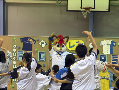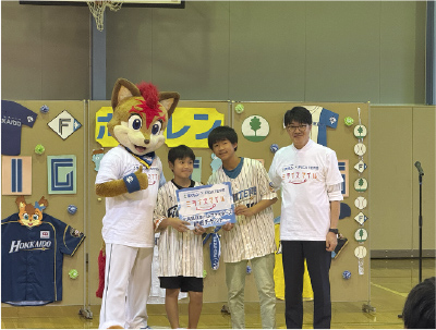 贈呈セレモニーに駆けつけてくれた特別ゲストは、ファイターズのマスコットキャラクターであるフレップ。人気者の登場に、子どもたちは大喜びです。