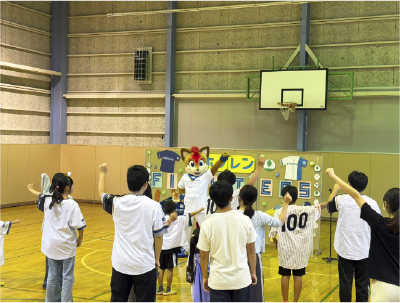 続いて、ファイターズマスコットキャラクターのフレップが特別ゲストとして登場。子どもたちと一緒に「YMCAダンス」を踊りました。フレップを間近に見ることができて、みんな大はしゃぎ。でもいざダンスの練習や本番となると顔は真剣に。楽しく充実した時間が過ぎ、終わった後は会場に達成感と笑顔が広がりました。